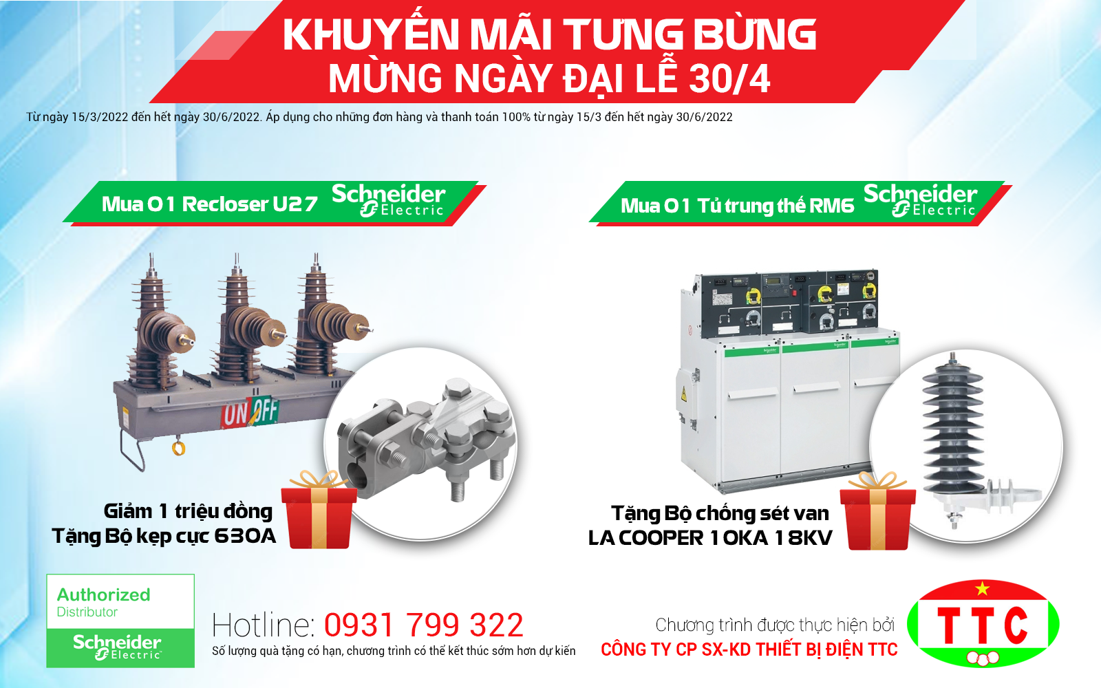 Đồng thời chào mừng ngày Giải Phóng Miền Nam 30.4 và Quốc Tế Lao Động 1.5, Thiết bị điện TTC triển khai chương trình khuyến mãi "KHUYẾN MÃI TƯNG BỪNG MỪNG NGÀY ĐẠI LỄ 30/4" đối với các sản phẩm tủ trung thề RM6 và Recloser mang thương hiệu Schneider Electric.